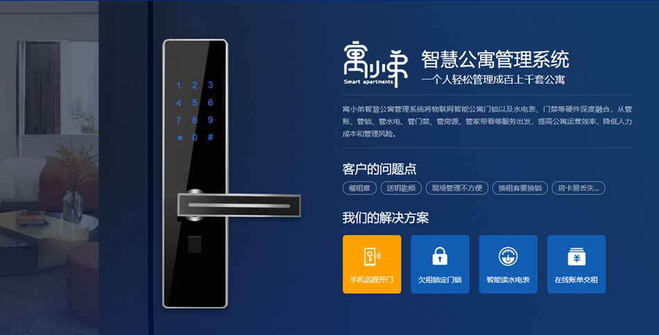 寓小弟這套系統可以用于一切長租型房屋,包括出租房、集體宿舍、辦公室、養老院等等,也可以用于部分短租房屋,但覓小窩更適合用于酒店、度假公寓、民宿等房屋。